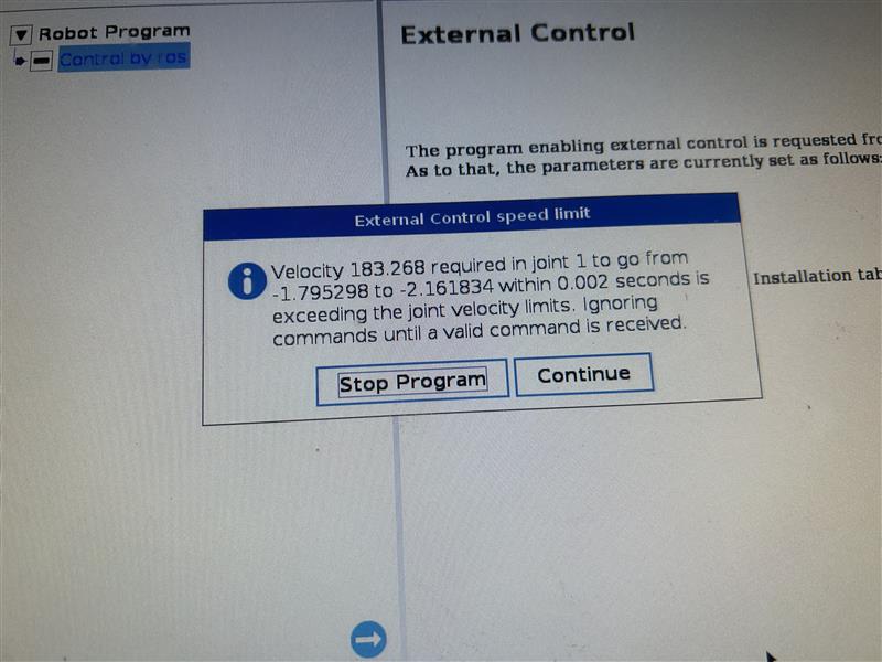 I am using ros2 humble version for controlling the ur10e robot. I get this error and my robot stops. I am using the default package from robot driver: ros2 launch ur_robot_driver ur_control.launch.py \ ur_type:=ur10e robot_ip:=10.6.0.16 kinematics_params_file:=/my_robot_calibration.yaml and to move the robot i use moveit packages: ros2 launch ur_moveit_config ur_moveit.launch.py ur_type:=ur10e. While on Rviz, when trying to move just a few positions up or down, there is this error and the robot stops motion. What should i do in order to rectify this?